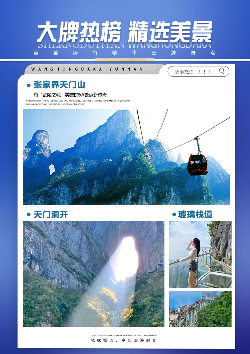 文学大师金庸欣然挥毫“天门仙山”四个大字;艺术大师黄永玉更两度洒墨,绘出天门山的神韵和巍峨。俯瞰张家界全景,观赏奇妙美丽的盆景花园,还有勇气之路悬空玻璃栈道,挑战你的高空极限!【天门山玻璃栈道】玻璃栈道是张家界天门山景区继悬于峭壁之上的鬼谷栈道、凭空伸出的玻璃眺望台、横跨峡谷的木质吊桥后打造的又一试胆力作。可与举世闻名的美国大峡谷玻璃走廊“天空之路”媲美,因而有了东方“天空之路”的美誉。
