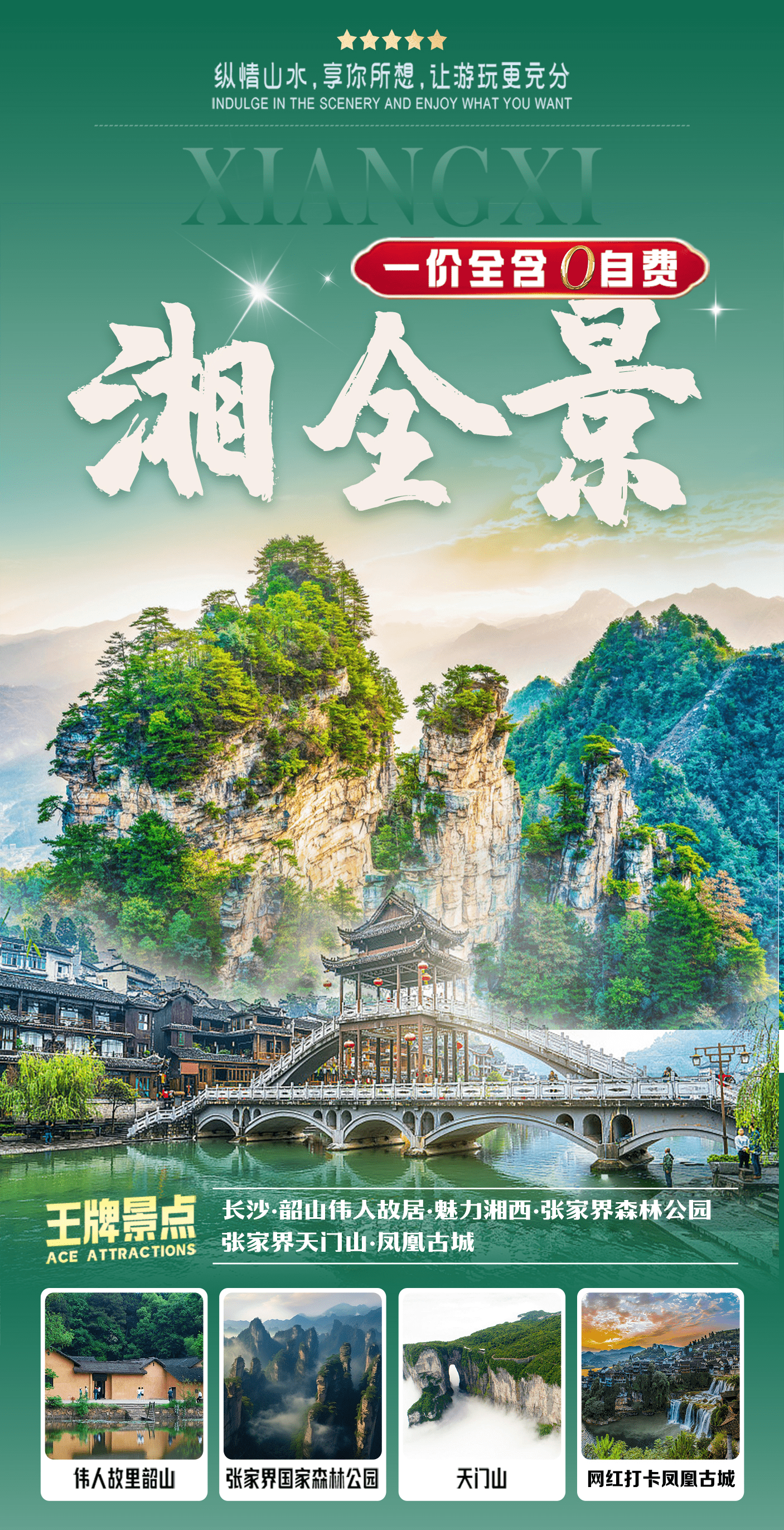 (赠送:百龙天梯单程、天门山扶梯、鞋套,韶山环保车、凤凰接驳车、湘西苗寨、张家界魅力湘西表演/千古情 所有景点无优无免无退费)