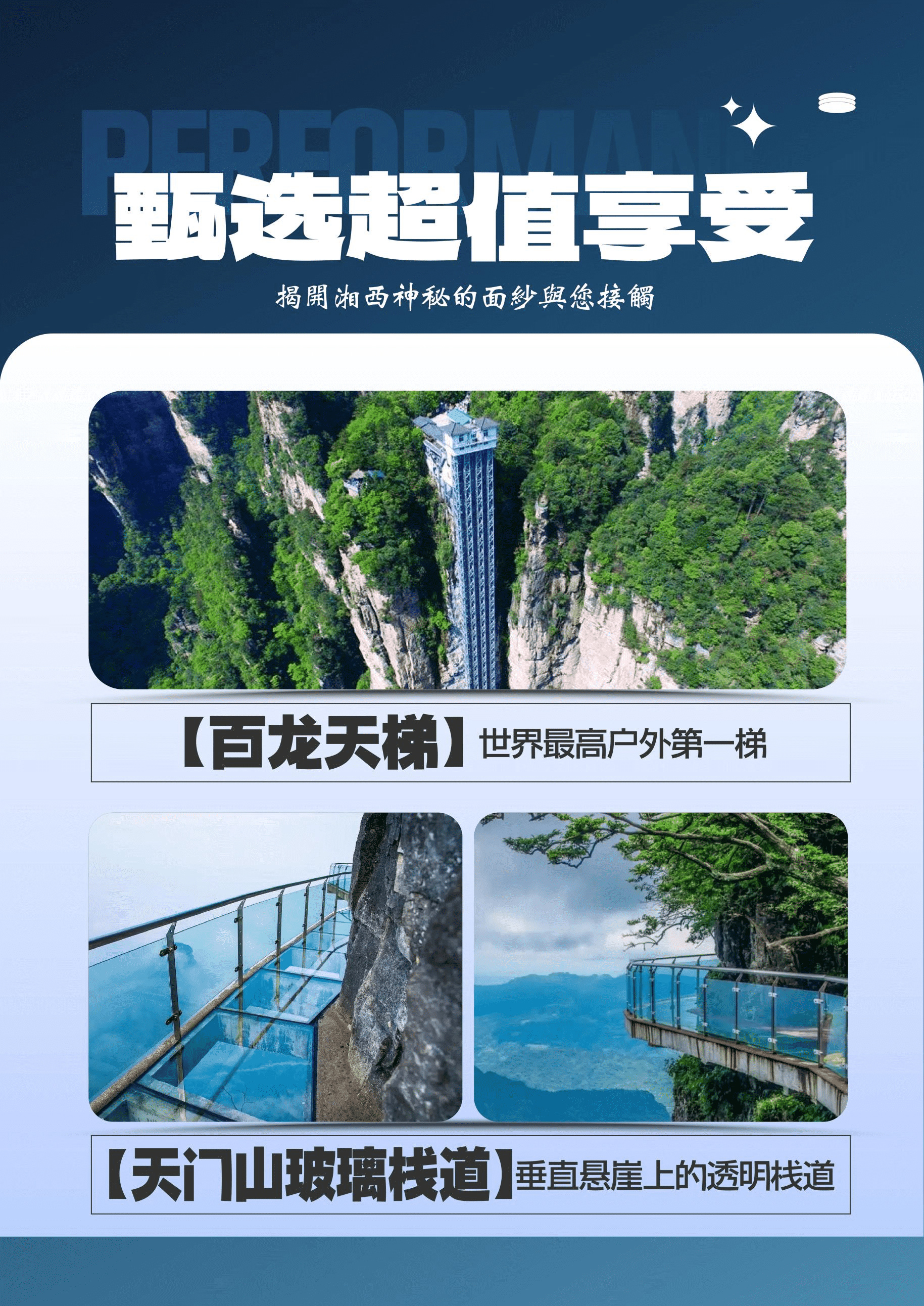 ●网红景点:世界最高户外第一梯—【百龙天梯】+垂直悬崖上的透明栈道—【天门山玻璃栈道】;
