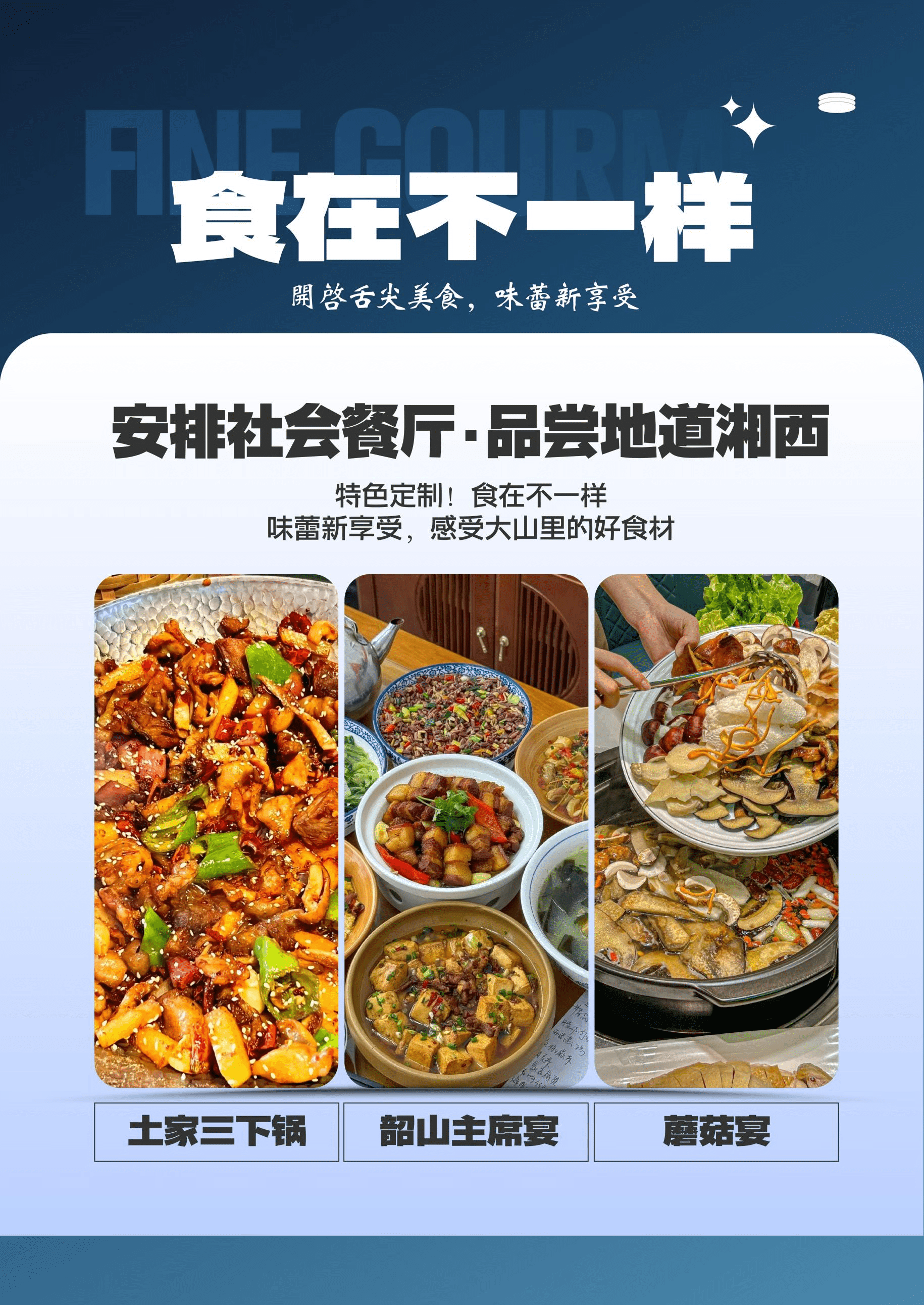 ●舌尖美食:特色定制!食在不一样,味蕾新享受,感受大山里的好食材,安排社会餐厅品尝地道湘西民间特色菜【土家三下锅、韶山主席、苗家宴等)