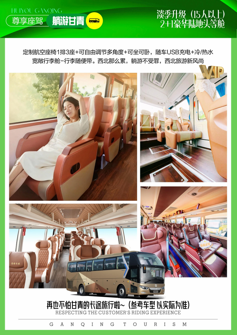 【升级豪华座驾】:淡季 3-5 月升级 2 +1 陆地头等舱旅游大巴( 15 人以上,含 15 人),
