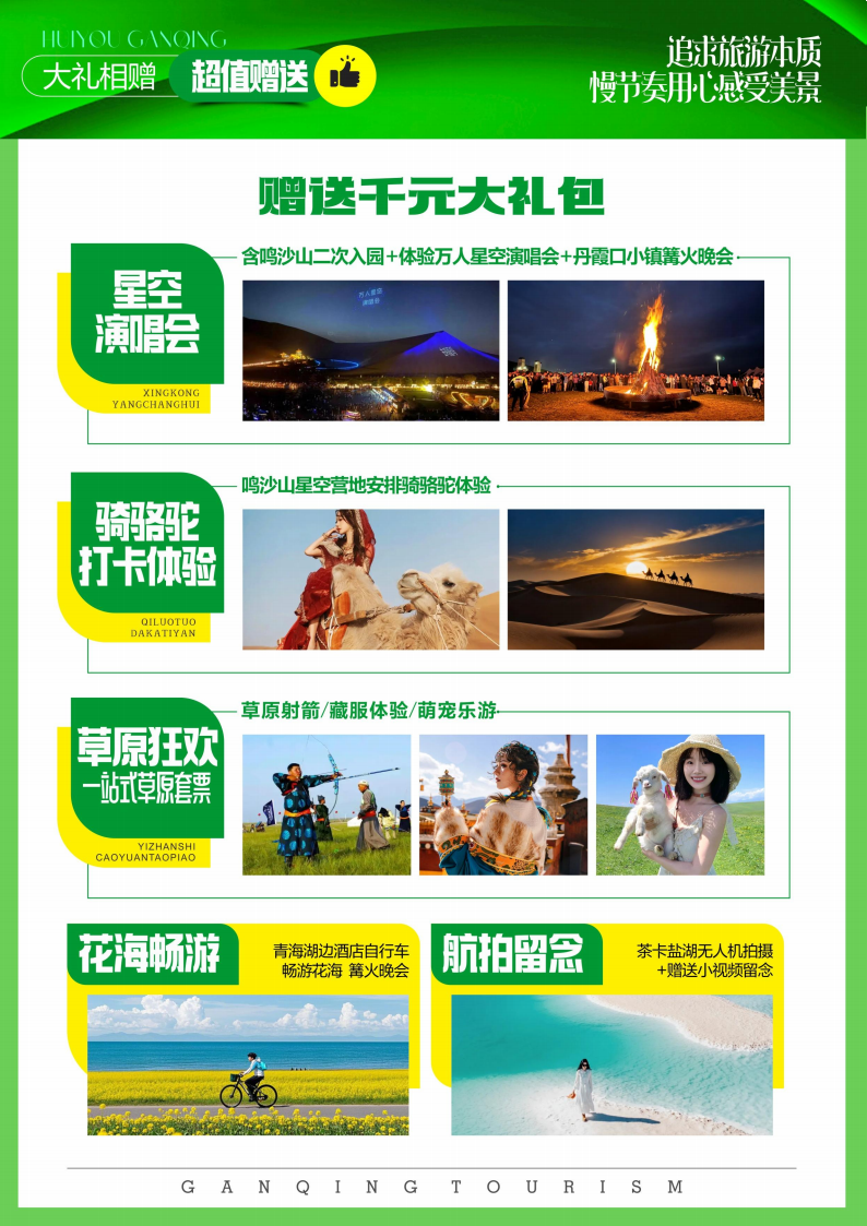 1、 门票:张掖七彩丹霞、鸣沙山月牙泉、莫高窟 B 类应急票、大柴旦翡翠湖、察尔汗盐湖、茶卡盐湖天空壹号、青海湖二郎剑等景区的首道门票;