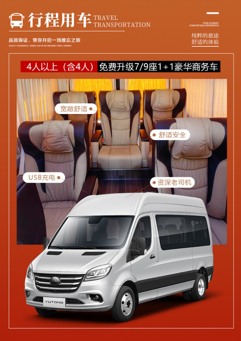 用车:行程用车保证每人一个正座,4人以上(含4人)免费升级7/9座1+1豪华商务车。