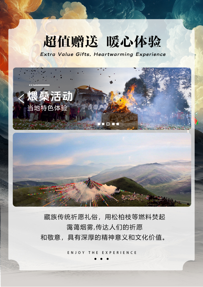 煨桑活动 (赠送项目,因客观原因导致赠送的项目体验不了,无费用可退):煨桑是藏族最普遍的宗教祈愿礼俗,仪式以点燃柏树枝为核心,撒糌粑、青稞等供品,伴经文诵读,兼具净化与祭祀之意。