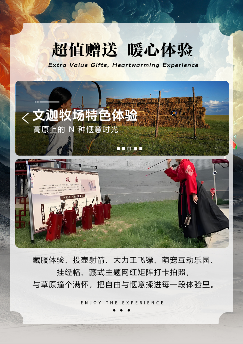 上午文迦牧场特色体验 (3.20日落地起开始赠送,因客观原因导致赠送的项目体验不了,无费用可退):藏服体验、投壶射箭、大力王飞镖、萌宠互动乐园、煨桑、挂经燔、藏式主题网红矩阵打卡拍照,解锁草原上的N种惬意时光。