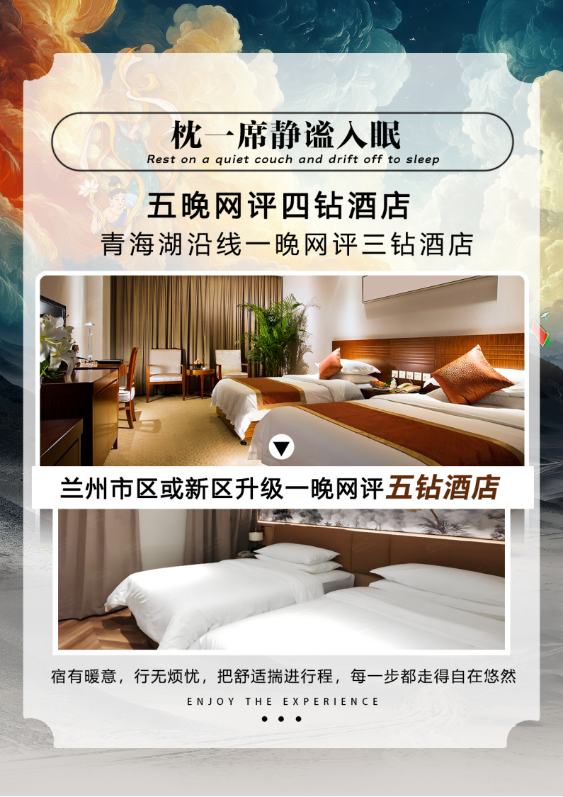 * 优选酒店:五晚网评四钻酒店,青海湖沿线一晚网评三钻酒店,兰州市区特别升级一晚五钻酒店