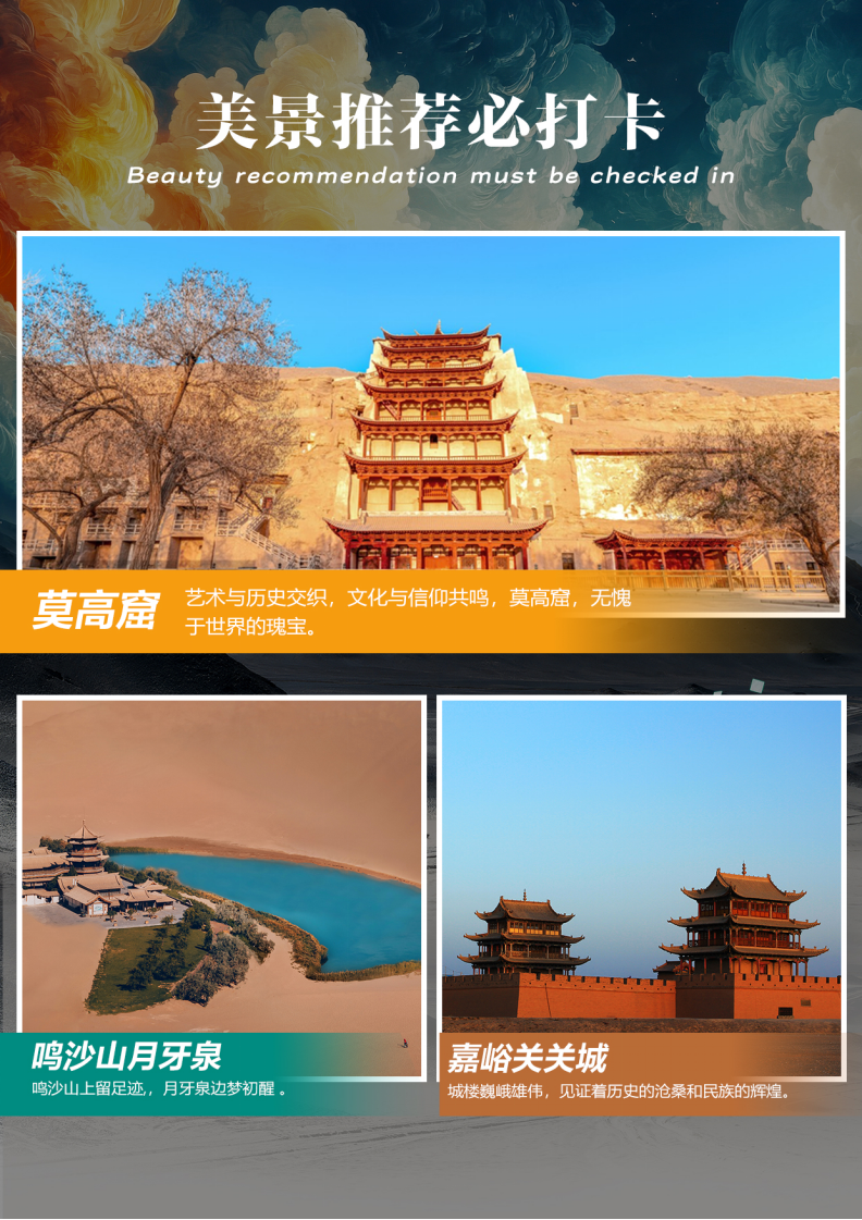 上午莫高窟(3月D票、游览3-4小时,4月B票,游览2-3小时):莫高窟是中外闻名的佛教艺术圣地,历经十余个朝代兴建。现存洞窟、壁画和彩塑数量庞大,兼具艺术与历史价值,是研究丝路文化的重要遗址。