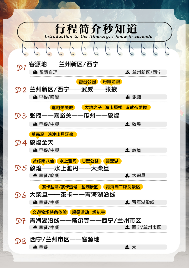 D7 | 青海湖沿线Ø塔尔寺Ø西宁/兰州市区 | √ | √ | × | 兰州/西宁 |