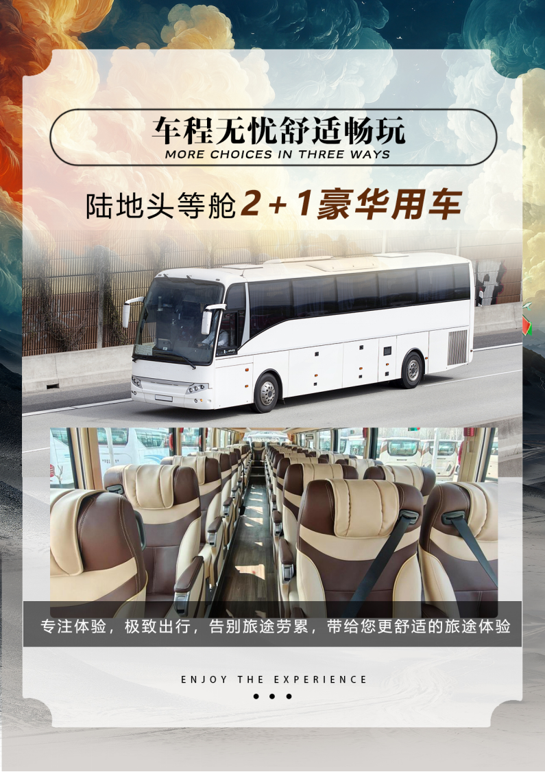 10人及以上安排2+1陆地头等舱豪华用车,1-7人安排7座或9座1+1豪华用车,8-9人安排14座普通车,保证一人一正座,不提供座次要求。因沿线有行车公里数限制及部分路段维修,易发生堵车,发车时间均较早,行程内标注出发及行车时间均为预计,具体情况可能略有不同;行程内所有自由活动期间及行程外均不含用车。请予以理解。
